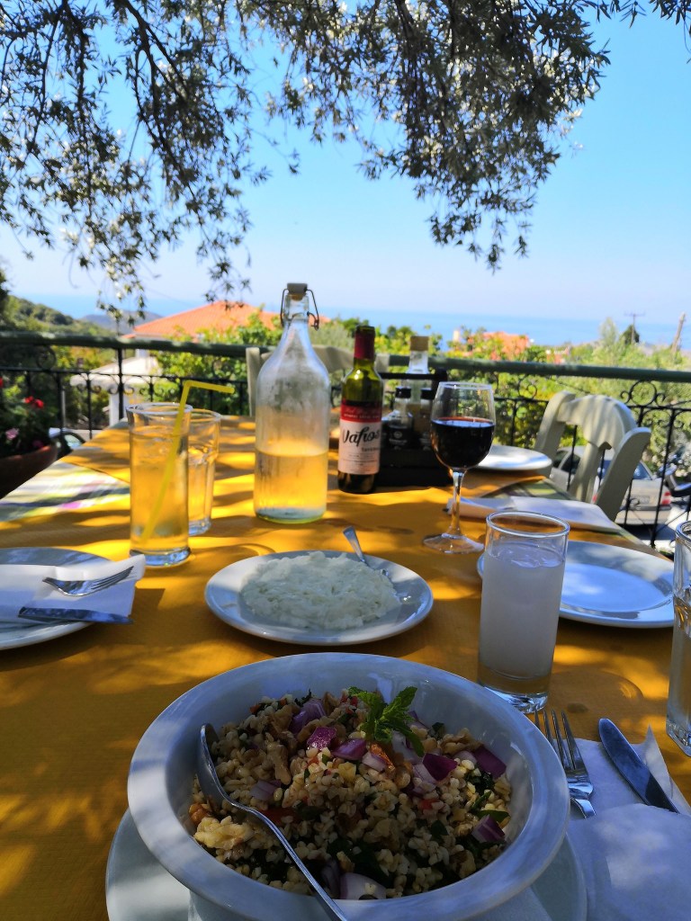 Bir önceki yaz (2019) Midilli seyahatinden güzel bir anı. Mide Lobisi’nde Anıl Can Kuscuoglu nun tavsiyesi üzerine bir öğle yemeği için aiecek Vafios Taverna’ya uğradık. Mekan Molyvos ve Petra’ya yakın kıyıdan biraz uzak yüksek bir konumda bu nedenle manzarası bir harika.